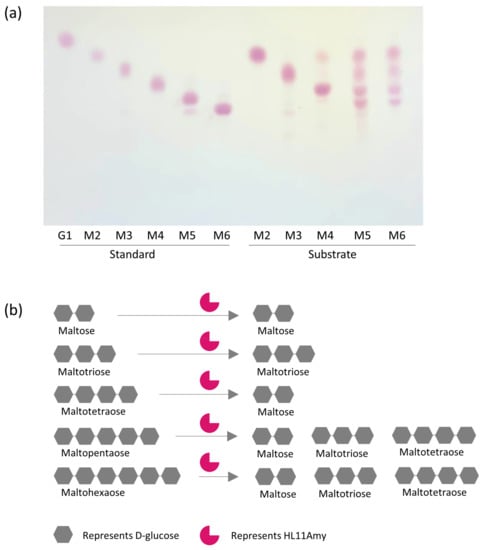 In this study, the specific cleavage pattern of recombinant HL11Amy on maltooligosaccharides with different degrees of polymerization ranging from two to six was investigated. Based on the product profile analyzed using TLC and HPLC, HL11Amy was able to cleave only maltooligosaccharides with chain lengths of four to six (Figure 6a,b). However, the cleavage on maltose (M2) and maltotriose (M3) was not observed under the experimental conditions. The results demonstrated that maltotetraose (M4) represented the smallest substrate for HL11Amy by releasing maltose (M2) as a final product. In addition, maltose (M2), maltotriose (M3) and maltotetraose (M4) were detected as final products from the hydrolysis of maltopentaose (M5) and maltohexaose (M6).
