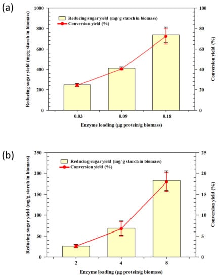 The effect of HL11Amy dosage on reducing sugar yield from cassava pulp hydrolysis. (a) Gelatinized cassava pulp hydrolysis efficiency determined based on starch content in biomass and total biomass; (b) raw cassava pulp hydrolysis efficiency determined based on starch content in biomass and total biomass. The reaction contained 1% (w/v) cassava pulp in 50 mM sodium citrate buffer pH 4.0 with the varying enzyme dosage and incubated at 50 °C for 24 h.