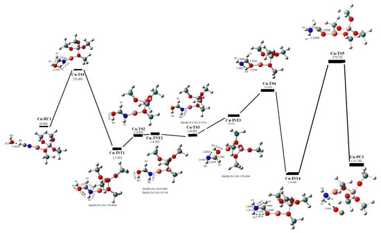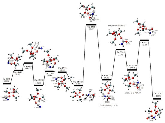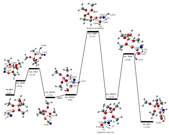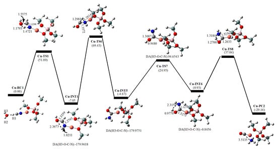 All calculations were performed using Gaussian 03 package []. B3LYP/6-31++g (d,p) basis set was employed in the molecular geometries of the reactant complexes (RC), transition states (TS), intermediates (INT), and product complexes (PC). As to the element of Cu, its core electrons were represented by LANL2DZ effective core potential. B3LYP was characterized by relatively low cost and high accuracy information, therefore, it was used for theoretical calculations [,,]. Zero-point energy (ZPE) [] correction was considered in the reaction, and all energy, enthalpy correction, and Gibbs free energy corrections were based on the frequency calculation. Intrinsic reaction coordinates (IRC) calculations [] were performed for each transition state to verify that all of the transition states were connected to the reactants and products.