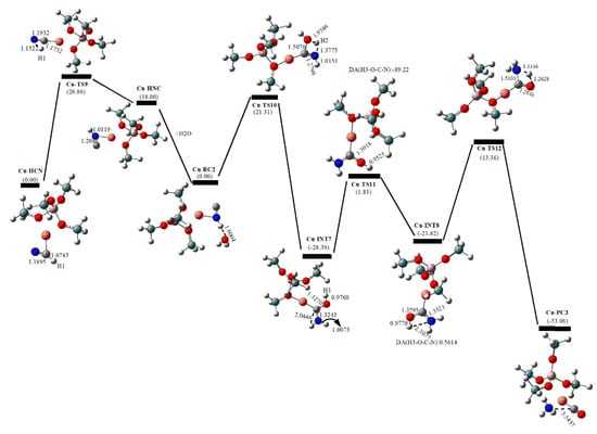 B3LYP/6-31++G (d,p)-optimized structures (in Å) of the stationary points of hydrolysis of HCN with Cu-ZSM5 in the gas phase for path C. The values correspond to the relative free energy (∆G) in kcal/mol with respect to the separate reactants.