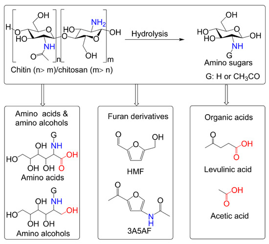 Chitin is an abundant nitrogen-containing polysaccharide. The effective transformation of chitin and its derivatives (i.e., chitosan, GlcNAc, and GlcNH2) to valuable chemicals has become an emerging research topic. Among chitin-derived compounds, two typical furan-derivatives, including HMF and 3A5AF, have attracted the most attention.