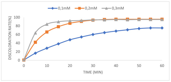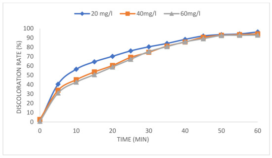 Initial dye concentrations are one of the most important components of the degradation reaction from the standpoint of application [28]. Figure 4 shows the discoloration efficiency as a function of electrolysis times; the dye was prepared at different concentrations from 20 mg/L to 60 mg/L. This result shows that for the first 30 min of electrolysis, the discoloration efficiency decreases from 80.4% to 75.3% when the concentration of pollutant increases from 20 mg/L to 60 mg/L, moreover the increase in organic pollutant concentration always leads to a decrease in the discoloration rate and prolongs the life of electrochemical oxidation process [14]. This can be explained by reaction 1’s reduction of H2O2 and Fe2+, or by the slower oxidation of a larger amount of organic matter with the same amount of hydroxyl radicals [29]. Therefore, it was insufficient to degrade organic pollutants at high concentrations. These results are confirmed by the findings of other researchers [30,31].