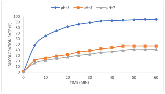 The EF process’s oxidation efficiency and in-situ OH. production in the reaction medium were both influenced by the pH of the wastewater [19]. Tests were performed at three different initial pH values (3, 5, or 7) to evaluate the impact of pH on the rate of discoloration (Figure 2). The EF process attained at pH = 5 and 7 had discoloration rates of 47.02% and 41.21%, respectively, because the hydrolysis and precipitation of Fe3+ become stronger when the pH is a high value. Therefore, the capacity of Fe3+ decreases [20]. When the pH is almost equal to 3, the efficiency of the EF process reaches a very high discoloration rate of almost 94%. The increase in the rate of discoloration can be explained by the increase in the activity of Fe(OH)+ in the aqueous solution [21]. This result is consistent with the findings of other researchers who reported that the Electro-Fenton process has an optimum pH of about 3 [22,23].