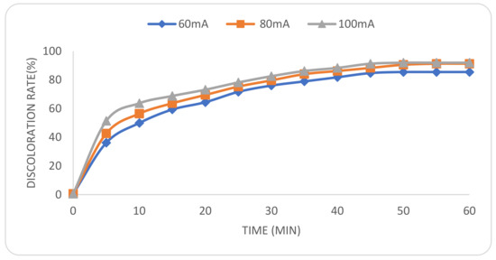 The current intensity is a critical parameter in electrochemistry since it influences oxidation efficiency [24]. The impact of the current intensity on the processing efficiency of the electrochemical system was investigated using different current intensities ranging from 60 to 100 mA. The rate of discoloration rises in proportion to the applied current’s intensity [25]. In all cases, the rate of discoloration was much quicker during the first 20 min of electrolysis, as indicated in Figure 3. The discoloration rate reached more than 94% with an intensity of 80 mA and 100 mA and an electrolysis time of less than 50 min. It is possible that increasing the current IC causes a quick increase in the formation of OH. hydroxyl radicals in the reaction media [26,27]. However, with an intensity of 60 mA and an electrolysis time of 60 min, the process allows for a discoloration rate of 85%, indicating that the current intensity applied improves the performance of the EF oxidation process.