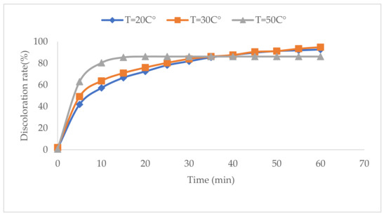 The effect of temperature on dye degradation was studied at 20, 30, and 50 °C and the results obtained are presented in Figure 5. The discoloration efficiency during the first 20 min increases from 72.42% to 86.21% when the temperature increases from 20 °C to 50 °C, respectively. These results show that increasing the temperature can promote the creation of hydroxyl radicals oxidizing the dye molecules [32]. Indeed, the temperature of the solution has an impact on the rate of electron transfer and, thus, on the rate of Fe2+ regeneration. However, 30 °C as the working temperature seems to be a reasonable choice [33] because when we increase the temperature from 20 °C to 30 °C, and after 50 min of electrolysis, we notice an increase in the discoloration rate of about 2%. On the other hand, we observe a decrease of about 8% when the temperature increases from 30 °C to 50 °C. The negative effect of temperature on the rate of discoloration, can be explained by the lower concentration of dissolved oxygen and the self-decomposition of hydrogen peroxide at high temperature [34].