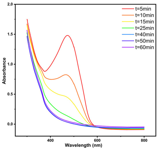 Figure 6 shows the evolution of the UV-visible spectra of the 60 mg/L methyl orange solution as a function of the electrolysis time. We see before treatment appears a broad absorption band of about 400–500 nm that characterizes the azo group [35]. This absorption band decreases steadily and in the same ratio throughout the electrolysis until it disappears after 60 min. This disappearance can be explained by the production of aromatic amines from the reduction of azo groups, which are highly reactive in the presence of oxygen [36], as well as the cleavage of aromatic rings to produce N2 gas [35], both of which result in a decrease in OM concentration, indicating that the degradation is effective.