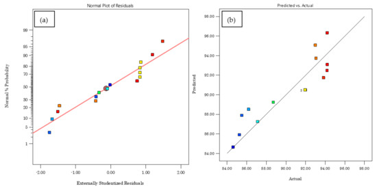 Indeed, the term X2 has a negative effect on the rate of discoloration with a negative coefficient of −0.034 in the same context. The normal graph of the residuals represented in Figure 7a indicates that the distribution of the points of the residuals follows the right line correctly, which justifies that the distribution is homogeneous. In addition, the importance of the experimental values was verified by plotting the predicted graph compared to the actual graph; we can then conclude that the method of Box-Behnken is suitable for our answer.