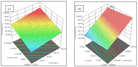 The design of experiments (Doe) approach is a robust tool for understanding and optimizing the experimental parameters of organic pollutant degradation by EF, allowing a rational interpretation of their influence on the selected response with a significant reduction in the number of experiments and a better understanding of the process mechanism [45]. In this study, the effect of the three parameters, namely, Fe2+ concentration (X1), applied current IC (X2), and pollutant concentration (X3) were described by a quadratic polynomial model using the following Equation (7) including linear effects, interaction effects, and quadratic effects, i.e., for k = 3 independent factors.