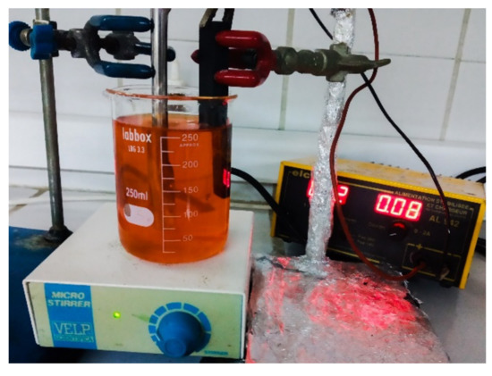 A digital power supply (AL-942, 1-3V, 0-2A) was used to apply DC current to a 250 mL undivided cylindrical glass cell with an internal diameter of 6cm and two electrodes. A carbon graphite electrode (1 cm × 1.5 cm × 10 was cm) was placed on the inner wall of the electrochemical cell covering the entire inner perimeter, and a stainless-steel electrode (1 cm × 2.5 cm × 16 cm) was inserted into the center of the cell. Before electrolysis, the solution was saturated with oxygen for 10 min by a pump (SOBO pump, 220–240 V). For the agitation of the solution, we used a digital mechanical stirrer (F203A0161, 500 rpm). To measure the temperature of the solution, we used a classical thermometer. The electrolyzes were carried out with a constant current (Figure 8). Before beginning the electrolysis process, a catalytic quantity of ferric iron was added to the solutions. The current was maintained constant during electrolysis, and samples were obtained at regular electrolysis times. The initial pH of the solutions was adjusted to 3 with sulfuric acid H2SO4 (0.1M) and sodium hydroxide NaOH (0.1M) and checked with a pH meter (HANNA instruments-HI 98127) which was well calibrated with standard buffers at pH values of 4 and 7 [41]. The ionic strength of the solution was kept constant at 50mM by the addition of Na2SO4 [42]. MO concentrations were determined by a UV-visible spectrophotometer (UV-2005, HJD501), and the detected wavelength was 464 nm as shown in Figure S1 [43]. The calibration curve was found as illustrated in Figure S2.