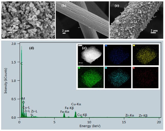 SEM images of (a) MOF-525-Fe/Zr (b) CF (c) MOF-525-Fe/Zr@CF; STEM-EDX scanning of MOF-525-Fe/Zr of (d) its normalized N, O, C, Fe, and Zr signals and (e) its composition maps of N, O, C, Fe, and Zr elements.