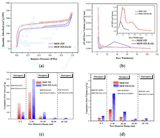 Furthermore, the pore size distribution of hollow and large pores was analyzed based on Barrett–Jouner–Halenda (BJH) method, and the pore size distribution of micropores was analyzed based on Horvath–Kawazoe (HK) method [33,34]. The calculation results are shown in Table 2. The pore volume and pore size of MOF-525 and MOF-525-Fe/Zr are 0.367 cm3/g and 2.347 nm, and 0.371 cm3/g and 3.682 nm, respectively. Combined with Figure 2b, it can be inferred that MOF-525 is mainly a microporous structure, while MOF-525-Fe/Zr has a wider distribution range of pore size and a multistage pore structure of the micropore-mesopore level. The area and volume of pores in the range of 0–120 nm are obtained by further analysis of adsorption isotherm curve with BJH method. As can be seen from Figure 2c,d, the pore area of MOF-525 is mainly provided by mesopore, accounting for 65.33% of the total pore volume. In the calculation of the cumulative contribution ratio of MOF-525-Fe/Zr pore area, the proportion of mesopore increases to 85.01%. The significant difference in proportion indicates that the increase in the number of mesopores in MOF-525-Fe/Zr greatly affects the pore area [35]. But the BET calculation of specific surface area is mainly based on the micropores, which results in a slight decrease of MOF-525-Fe/Zr specific surface area compared with MOF-525. Meanwhile, it can be seen that the multistage pore structure further enlarges the pore volume of MOF-525-Fe/Zr [36,37].