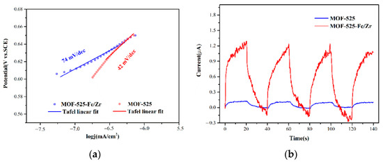 Accurate and efficient assessment inactivity for electrocatalytic oxygen reduction (ORR) is critical for the development of PEF catalysts [49]. The ORR kinetics mechanism can be revealed using linear sweep voltammetry (LSV) test electrode polarization curve and the Tafel slope b fitted by the Tafel formula (Equation (8)) [50]. As shown in Figure 4a, the Tafel slope of MOF-525-Fe/Zr is 42 mV/dec, which is significantly lower than that of MOF-525 (74 mV/dec) as well as some commercial ORR electrocatalysts, such as Pt/C (86 mV/dec) and IrO2 (120 mV/dec) and the Pt/Pd/Co-NC (74 mV/dec) [51,52]. The comparison results show that MOF-525-Fe/Zr has lower ORR resistance and higher charge transfer rate, which can efficiently reduce O2 to produce an active oxidant [53]. This may be because the MLCT transition in Fe-TCPP is excited by electrochemical polarization. MLCT enables electrons to be excited from the metal local orbital to the vacancy ligand local orbital, reducing the mass transfer resistance caused by the organic ligand and enhancing the electrocatalytic activity of MOF [54].