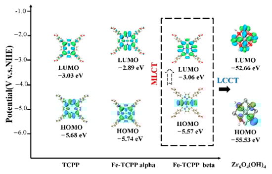 To understand the electronic structure, optical properties, and charge transfer mechanism of MOF-525 and MOF-525-Fe/Zr, the forward orbital of TCPP and Fe-TCPP transition was calculated by density functional theory (DFT) simulation [59]. The results are presented on the left side of Figure 5. It is found that the ground state of TCPP is a singlet state, while the ground state of Fe-TCPP process is a triplet state with the increase of electron density. In spin-unrestricted DFT calculations performed for triplet states, α and β electrons occupy different spatial orbitals, so it makes sense to compare the relative energies of the lowest triplet states [60]. The highest energy level orbital HOMO (π) on the TCPP segment is located between the pyrrole ring nitrogen and the adaptive front molecular orbital (FMO), while the lowest energy level orbital LUMO (π *) is located on the acceptor group benzene ring. Therefore, DFT calculated that TCPP has HOMO→LUMO internal charge transfer (ILCT) transitions at lower energy absorption bands [61]. However, when the pyrrole donor site further binds with iron ion, HOMO and LUMO are delocalized due to intramolecular charge separation. The HOMO electron density distribution is significantly biased toward the central Fe atom, and the lowest energy excitation state changes from (π→π *) ILCT to (d→π *) triplet 3MLCT, and the light absorption band is redshifted [62]. Compared with TCPP, the HOMO-LUMO bandgap of the Fe-TCPP ground state changes from −2.65 eV to −2.51 eV, which is also attributed to the MLCT transition in the metalloporphyrin. The narrowing of the bandgap of MOF-525-Fe/Zr leads to the narrowing of the band gap between the valence band and the conduction band, which indicates that the conjugation degree of π electrons is improved.