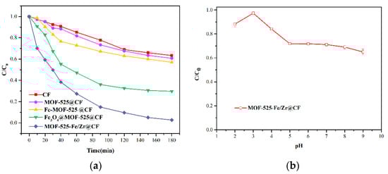 In addition to the influence of catalyst preparation, the influence of environmental factors on the photoelectric performance of catalyst cannot be ignored. PEF process is very sensitive to the water pH; it is necessary to determine the effect of initial pH on the SMX degradation efficiencies. Better adaptability to pH change of MOF-525-Fe/Zr@CF can be observed in the PEF process for degradation of SMX [65]. At pH = 3.0, 93.7% of SMX was degraded within 180 min, while the degradation efficiency of SMX remained above 70% with the change of pH from 2.0 to 8.0 (Figure 6b). Meanwhile, MOF-525-Fe/Zr has a higher degradation efficiency for acidic water in PEF process correspondingly, and the overall degradation efficiency increases and then decreases with the increase of pH. This can be attributed to the fact that when MOF-525-Fe/Zr is suspended in an alkaline solution, the carboxylic acid groups (connector between Zr-oxo SBUs and Fe-TCPP) can be partially polarized [45].