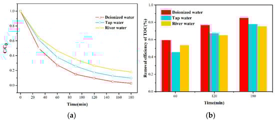 To further investigate the efficiency of MOF-525-Fe/Zr@CF-catalyzed PEF reaction to degradation SMX in practical applications, deionized water, tap water, and river water were used as the sample solution. Before the reaction the sample solutions were filtered through a 0.45 μm microporous membrane and the initial pH was adjusted to 3.0, so as to compare the degradation efficiency of the sample solutions more accurately. With MOF-525-Fe/Zr@CF as the cathode and platinum sheet as the anode, an evaluation experiment was carried out. According to the experimental results of the catalytic PEF reaction in Figure 7a, the degradation rates of the MOF-525-Fe/Zr-modified cathode toward SMX in deionized water, tap water, and river water are 97.3%, 90.2%, and 82.0%, respectively. The reason for the decrease in degradation rate is that other organic pollutants in tap water and river water would react with oxidative substances,(such as active free radicals in the process) acting as competitors of SMX. We further tested the TOC value of each reaction solution sample, and the results are shown in Figure 7b and Table 3. The results further confirmed that the initial TOC values of tap water and river water were higher, demonstrating the concentration of organic pollutants was higher. Despite the interference of various organic pollutants, it can be seen in the above figure that with the prolongation of the reaction time, the SMX degradation efficiency of MOF-525-Fe/Zr-modified cathode continued to increase, and after 180 min, the TOC removal rates of the three water samples were more than 75%. Moreover, MOF-525-Fe/Zr-modified cathode significantly improves the mineralization rate of SMX compared with MOF-like catalysts proposed in previous studies (Table 3) [66,67,68,69,70,71,72,73,74].