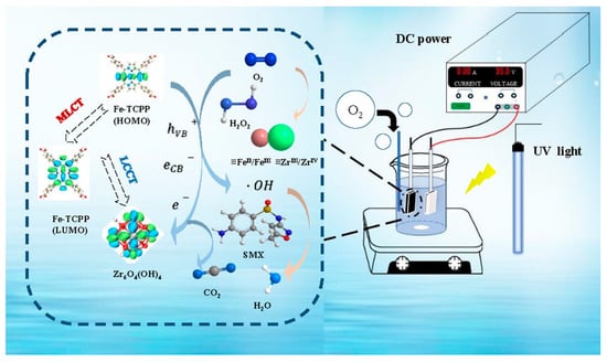 Thus, the mechanism of MOF-525-Fe/Zr-modified cathode-catalyzed PEF degradation is tentatively proposed. First, the light source and the power supply in the PEF process can accelerate the carrier transport process by synergistically stimulating the MLCT and LCCT transitions on MOF-525-Fe/Zr surface. The carriers including photogenerated electrons (eCB−), holes (hVB+), and cathode electrons (e−) further catalyze the occurrence of a series of redox reactions centered on Fenton reactions (such as ORR and surface metal redox reactions). Second, the active species (•OH, h+ and •O2−) continuously produced by redox reactions can completely degrade SMX and convert it into CO2 and H2O [83]. The specific reaction process and mechanism are shown in Figure 9.
