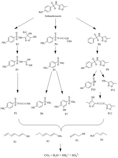 According to the identified fragments, it can be inferred that the generated ring-opening products are small molecular compounds S1-4. It has also been proved in the studies of many scholars that these short-chain acids can be further oxidized into CO2 and H2O while SO42− and NH4+ ions are released, leading to the complete mineralization of SMX [79,91,92].