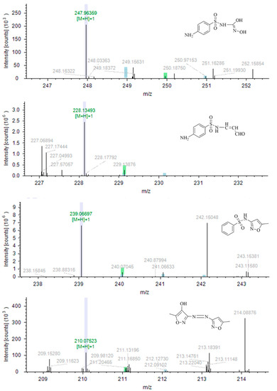 According to the experimental results in Section 2.4.1, after 180 min reaction, the SMX degradation rate and TOC degradation rate of MOF-525-Fe/Zr-modified cathode reached 97.3% and 85%, respectively, not 100%. This indicates the formation of intermediates in the degradation process. The intermediates of SMX degradation in MOF-525-Fe/Zr catalyzed PEF process were determined and analyzed by HPLC-MS. The spectrogram obtained was compared with the instrument database, and the corresponding SMX degradation pathway was obtained as shown in Figure 10, and the mass spectrogram of intermediate compounds is shown in Figure 11.