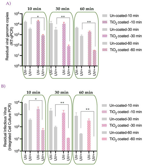 The effect of TiO2 and UVA-LED irradiation on the stability of human coronavirus, HCoV-OC43. (A) 100 μL of HCoV-OC43 virus was spotted on uncoated as well as TiO2-coated coverslips followed by exposure to UVA light for 10, 30, and 60 min. Post UV-irradiation, total viral RNA was extracted for the detection of intact viral genome copies via RT-qPCR. (B) 100 μL of HCoV-OC43 virus was applied on both uncoated and TiO2-coated coverslips and exposed to UVA light for 10, 30, and 60 min, followed by infection of A549-hACE2 cells for 1–2 h. Post infection of A549-hACE2 cells, fresh medium was added, and the cells were incubated for 2 days. Post 48 h, total viral RNA was extracted to detect intracellular viral genome copies following infection and replication (* p < 0.1, ** p < 0.01).