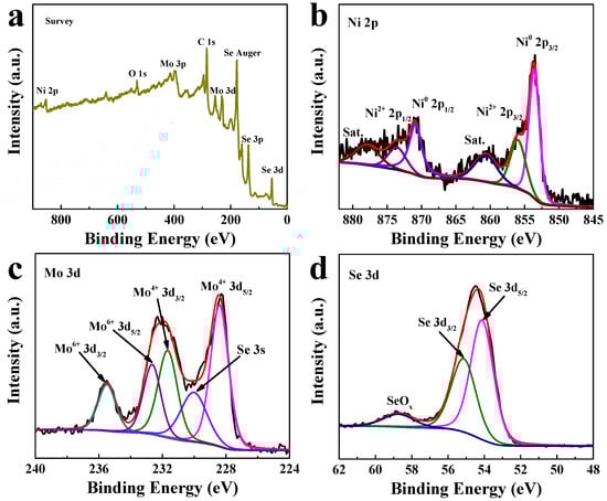 The chemical states of as-prepared NiSe2/MoSe2 Hs/G composite were measured by X-ray photoelectron spectroscopy (XPS). As shown in Figure 2a, the predominant elements of Ni, Mo, Se, and C are observed in the XPS survey spectrum of the NiSe2/MoSe2 Hs/G composite. The Ni 2p spectrum (Figure 2b) demonstrates that peaks located at 853.6 and 870.9 eV are assigned to the Ni0 2p3/2 and Ni0 2p1/2 of metallic NiSe2, and a couple of peaks located at 856.1 and 873.7 eV belong to the Ni2+ 2p3/2 and Ni2+ 2p1/2 of Ni oxidation state [31]. Moreover, the remaining two peaks located at 860.8 and 877.9 eV are ascribed to the satellite peaks of Ni 2p [32]. In the Mo 3d spectrum (Figure 2c), the Mo4+ 3d5/2 and Mo4+ 3d3/2 peaks are observed at 228.4 and 231.7 eV, which are ascribed to Mo4+ in MoSe2 [33]. Furthermore, the relatively smaller peak at 230.1 eV is attributed to the Se 3s, while the high binding-energy peaks of Mo6+ 3d5/2 (232.7) and Mo6+ 3d3/2 (235.5 eV) correspond to MoO3 species, which may result from the oxidation of the catalyst sample in air [24]. In the Se 3d spectrum (Figure 2d), the Se 3d5/2 and Se 3d3/2 peaks appear at 54.1 and 55.2 eV, respectively, revealing the existence of Se2- [34]. In addition, another peak at 58.9 eV is originated from the oxidation states of the exposed Se edge [35]. The XPS data of Ni 2p, Mo 3d and Se 3d including peak positions and amounts for the composite material is summarized in Table S1. The ratio of Ni to Mo in the hybrid material is ~1.16:1, which is close to the raw materials. In the C 1s spectrum (Figure S3), the peaks located at 284.6, 286.7, and 288.9 eV are attributed to the C-C, C-O, and COOH bonds of graphene, respectively [36]. These XPS results further confirm that the NiSe2-MoSe2 HTs/graphene composite was successfully formed in the one-step hydrothermal process.