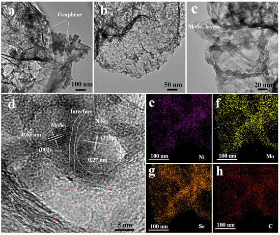 The TEM analysis was further used to characterize the nanostructures of the NiSe2-MoSe2 HTs/G composite. The TEM images (Figure 4a,b) show that the uniform NiSe2-MoSe2 HTs nanostructures are tightly supported on the surfaces of graphene, which is consistent with SEM images. The high-resolution TEM image (Figure 4c) further indicates that many nanosheet-like MoSe2 nanostructures present abundant exposed few-layered edges, implying that combining MoSe2 with NiSe2 and graphene can be advantageous to prevent the stack of MoSe2 layers and maximally expose more active MoSe2 edges. Moreover, the HRTEM images (Figure 4d and Figure S6) demonstrate the formation of the NiSe2-MoSe2 heterostructures, which are constructed by NiSe2 nanocrystallites uniformly embedded in few-layered MoSe2 nanosheets (<10 layer). Compared to pure NiSe2, the NiSe2 nanocrystallites show a smaller particle size of ~10 nm. The discontinuous and distortion lattice fringes reveal that the NiSe2 and MoSe2 in the heterostructures possess rich defects, which can be employed as active sites in HER reaction [39]. Compared with bulk MoSe2 (0.65 nm), the highly expanded lattice fringe of about 0.68 nm corresponds to the (002) planes of 2H-MoSe2 [40]. The clear lattice fringes of 2H-MoSe2 indicate that the MoSe2 in the NiSe2-MoSe2 hybrid is not amorphous. In addition, the lattice fringes of 0.27 nm on ultra-small NiSe2 nanocrystallites correspond to the (210) planes of cubic NiSe2 [41]. The relevant element-mapping images of NiSe2-MoSe2 heterostructure-grown graphene (Figure 4e–h) display that the Ni, Mo, and Se elements are evenly distributed across the nanosheet-like nanostructure (Figure S7), suggesting that the ultra-small NiSe2 nanoparticles are uniformly distributed in the MoSe2 nanosheets.