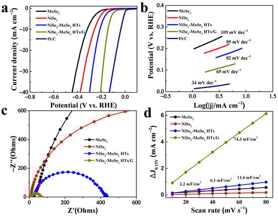 Figure 5. (a) Polarization curves of MoSe2, NiSe2, NiSe2-MoSe2 HTs, NiSe2-MoSe2 HTs/G, and Pt/C. (b) Tafel plots of MoSe2, NiSe2, NiSe2-MoSe2 HTs, NiSe2-MoSe2 HTs/G, and Pt/C. (c) EIS spectra of MoSe2, NiSe2, NiSe2-MoSe2 HTs, and NiSe2-MoSe2 HTs/G. (d) Estimated Cdl of MoSe2, NiSe2, NiSe2-MoSe2 HTs, and NiSe2-MoSe2 HTs/G.