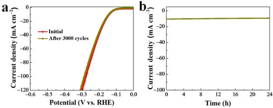 To measure the stability of the as-prepared NiSe2-MoSe2 HTs/G composite during HER testing under alkaline conditions, a successive 3000 CV measurement was performed (Figure 6a). It indicated that the LSV curve shape of NiSe2-MoSe2 HTs/G after 3000 CV cycles is very close to the initial one, revealing the excellent stability under alkaline condition. Moreover, the HER stability of NiSe2-MoSe2 HTs/G was also evaluated by using a time dependence of the current density (i-t) test at a constant overpotential of 144 mV. As shown in Figure 6b, the current density at 10 mA cm−2 displays no significant variation from 0 to 24 h, suggesting the long-term stability in the alkaline HER.