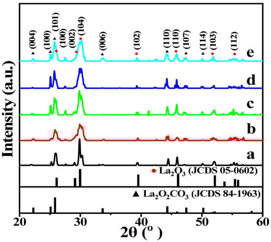 XRD pattern of the La2O3 and X-La2O3 catalysts. (a) La2O3; (b) Li-La2O3; (c) Mg-La2O3; (d) Zn-La2O3; (e) Ce-La2O3.