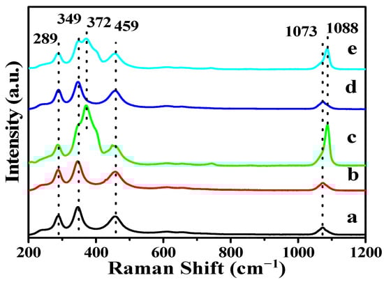 Raman spectra of the La2O3 and X-La2O3 catalysts. (a) La2O3; (b) Li-La2O3; (c) Mg-La2O3; (d) Zn-La2O3; (e) Ce-La2O3.