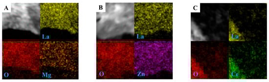 HR-STEM image and HAADF-STEM-EDX element-mapping analyses of La (yellow), O (red), Mg (orange), Zn (purple), Ce (green), (A) Mg-La2O3, (B) Zn-La2O3, (C) Ce-La2O3.