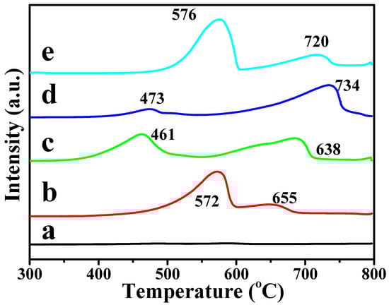 H2-TPR profiles of the La2O3 and X-La2O3 catalysts. (a) La2O3; (b) Li-La2O3; (c) Mg-La2O3; (d) Zn-La2O3; (e) Ce-La2O3.