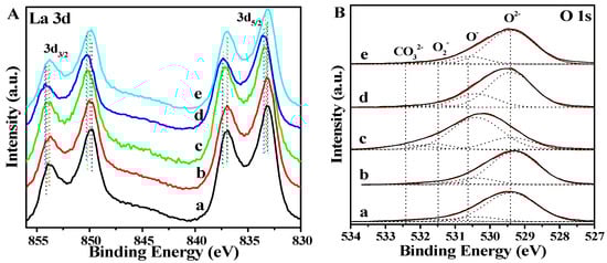 XPS spectra of La3d (A) and O1s (B) over the La2O3 and X-La2O3 catalysts. (a) La2O3; (b) Li-La2O3; (c) Mg-La2O3; (d) Zn-La2O3; (e) Ce-La2O3.