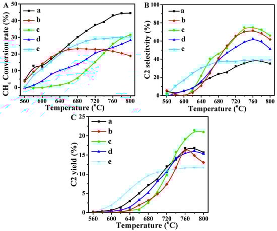 The catalytic selectivity of C2 products (ethane and ethylene) over the catalysts for OCM was investigated at temperatures ranging from 500 to 800 °C, and the results are shown in Figure 8B. With the increase in the reaction temperature, the selectivity of the C2 products first increases and then decreases, and it reaches the maximum at 760 °C, indicating that the temperature is the optimum reaction condition for the catalytic OCM reaction, and the higher temperature can decrease the performance of the catalysts. If the temperature is decreased again, the CH4 conversion and the selectivity of C2 products will be restored. The pure La2O3 catalyst shows relatively low selectivity of C2 products, i.e., its value is just 30%. Thus, although the pure La2O3 catalyst has high CH4 conversion, its selectivity of C2 products is low, which is attributed to its lack of redox properties demonstrated by H2-TPR. The CH4 over the La2O3 catalyst is deep oxidized to CO2 and CO, rather than producing the target product with C–C bond coupling []. Thus, the selectivity of pure La2O3 is remarkably lower than that of other catalysts.