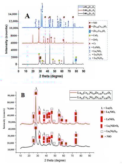 - Dezvareha, P.; Aghabozorgb, H.; Hossaini Sadrc, M.; Zared, K. Synthesis, characterization, and catalytic performance of La1−xCexNi1−yZryO3 perovskite nanocatalysts in dry reforming of methane. Orient. J. Chem. 2018, 34, 1469–1477. [Google Scholar] [CrossRef]