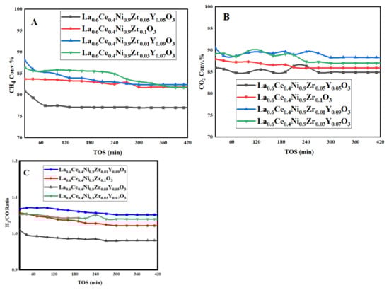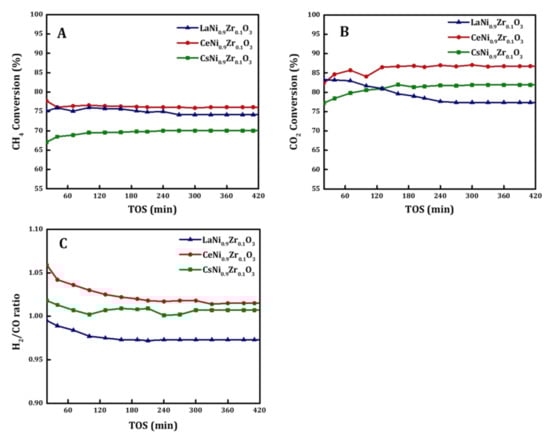 - Lanre, M.S.; Abasaeed, A.E.; Fakeeha, A.H.; Ibrahim, A.A.; Alquraini, A.A.; AlReshaidan, S.B.; Al-Fatesh, A.S. Modification of CeNi0.9Zr0.1O3 Perovskite Catalyst by Partially Substituting Yttrium with Zirconia in Dry Reforming of Methane. Materials 2022, 15, 3564. [Google Scholar] [CrossRef]