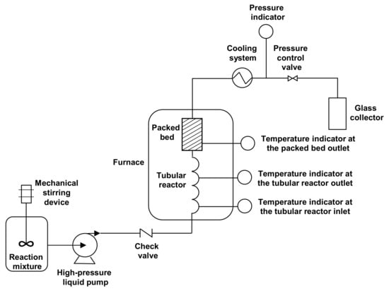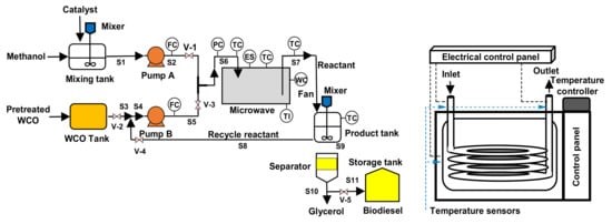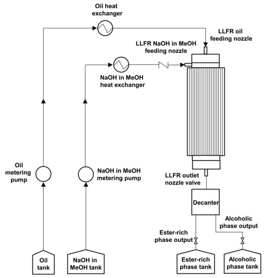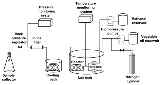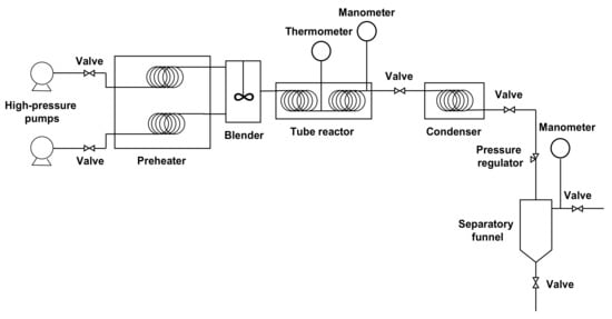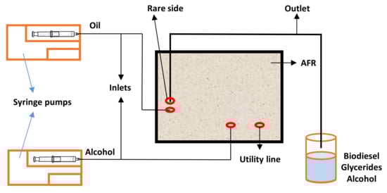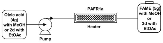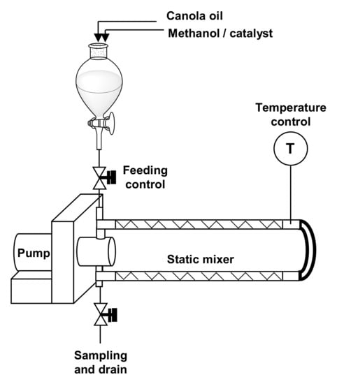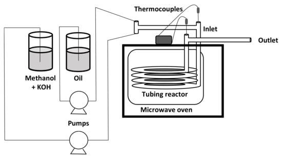 The microchannel reactors used to produce biodiesel usually consisted of a stainless-steel capillary or a quartz tube. The reactor was connected to an HPLC pump, and the other to a collection system, respectively. The temperature was controlled by immersing the reactor in a water bath at a controlled temperature. This type of reactor allows us to obtain rapid reaction rates, through the improvement of heat and mass transfer; a high surface/volume ratio; and a short diffusion distance [].