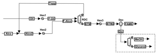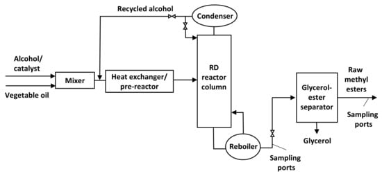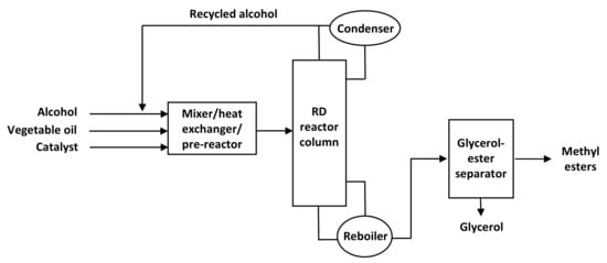 - Boonanuwat, N.; Kiatkittipong, W.; Aiouache, F.; Assabumrungrat, S. Process design of continuous biodiesel production by reactive distillation: Comparison between homogeneous and heterogeneous catalysts. Chem. Eng. Processing 2015, 92, 33–44. [Google Scholar] [CrossRef]