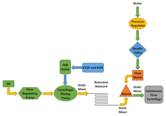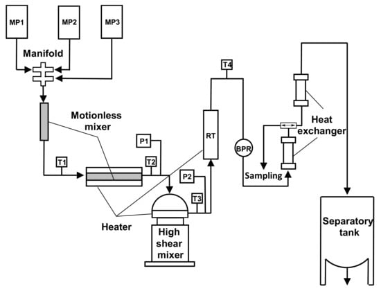 The optimization of temperature and reaction time is easier in the continuous flow process, varying the reactor temperature and controlling the reaction time by the flow rate. Considering the liquid–liquid reactions in batches, vigorous agitation produces emulsions, with the production of droplets which, however, are not homogeneous in size. Therefore, when a homogeneous emulsion is required, it is preferable to use a continuous flow process.