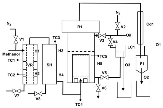 Continuous flow bubble column reactor. Vaporizer (VR); superheater (SH); bubble column reactor (R1); level controller (LC1); condenser (Cd1); glass container for sample collector (F1); valves (V1–V8); electrical heaters (H1–H5); temperature controllers (TC1–TC5); pipe on the top of F1 (O1); pipe on the bottom of F1 (O2); inner pipe in the LC1 (O3).