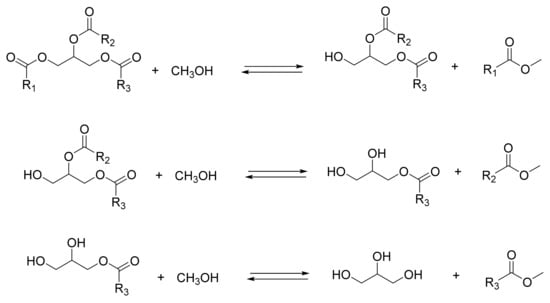 The reaction occurs in the presence of enzymes, homogeneous or heterogeneous, alkaline or acidic catalysts, and in supercritical conditions. The process consists of three consecutive and reversible reactions, in which triglycerides are converted into diglycerides, then into monoglycerides, and finally into glycerol. An ester is produced in each of the three reactions. Thus, starting from a molecule of triglyceride at the end of the overall reaction, three molecules of esters are obtained and glycerol is produced as a byproduct (Scheme 1) [].