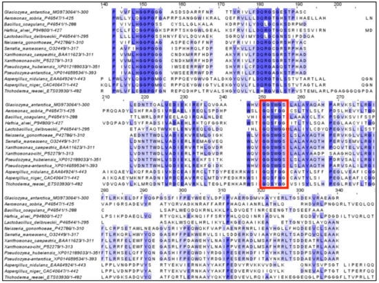 Multiple sequence alignment of catalytic domains of proline iminopeptidases from several monomeric and multimeric sequences obtained from the NCBI. The conserved motif is highlighted with a red box.