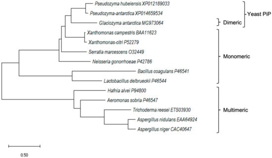 The nucleotide sequence for GaPIP was 960 bp, which has been submitted to the GenBank (Accession number MG973064). The gene encoded a 319 amino acid protein with a calculated molecular mass of 35.4 kDa. No signal peptide was predicted for GaPIP; thus, this protein was predicted to be an intracellular protein. Multiple sequence alignment of amino acid sequences revealed that this protein has a similar domain to other PIPs (Figure 1). Amino acid sequence alignment of GaPIP with other known microbial proline aminopeptidases and analysis of conserved domain demonstrated that GaPIP is an α/β-hydrolase fold serine peptidase. It contains a Ser-Asp-His active triad (amino acid positions −111, −269, and −297) and a highly conserved motif G-X-S-X-G to the serine aminopeptidase; GGSWG (Figure 1). In Aeromonas sobria and Bacillus coagulans PIP, serine residue in the GXSXG motif is responsible for the catalytic activity of the PIP enzymes [23]. In most cases, the GXSXG motif is conserved within multimeric PIPs, but other motifs, such as the GGSWG, GQSWG, and GHSWG, are also found in multimeric PIPs [22]. Based on the phylogenetic analysis, all PIP proteins were grouped according to the number of PIP domains in their structures (Figure 2). The G. antarctica PIP was closely related to Pseudozyma PIP (Figure 2). This result was expected as both yeasts are classified under the phylum Basidiomycota. Although GaPIP was closely related to the monomeric PIPs with similar conserved motifs, interestingly, GaPIP was found to be in the dimeric form (Section 2.2). This divergence may be due to the sequence evolution or horizontal gene transfer in the yeast genome. In contrast with most bacterial PIPs, a few bacterial PIPs have multimeric domains, such as A. sobria, which is similar to the fungi PIPs [22,23].