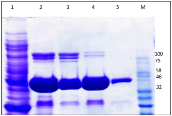 SDS-PAGE profile of the recombinant GaPIP. Lane 1: Whole-cell protein extract of GaPIP expressed in E. coli BL21(DE3) STAR; Lane 2: Purified GaPIP using Ni-NTA; Lane 3–5: Purified GaPIP using gel filtration chromatography from different elution; M: Protein Marker Broad Range (NEB, Ipswich, MA, USA).