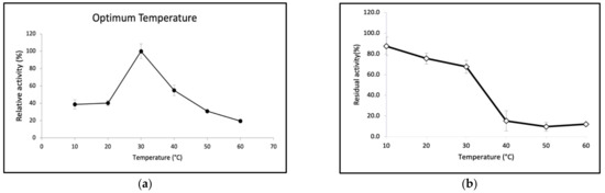 Effect of temperature on enzyme (a) activity and (b) stability of purified GaPIP. The optimal temperature was determined by measuring the enzymatic activity and stability at different temperatures ranging from 0 to 60 °C. The error bars represent the standard deviation (n = 3).