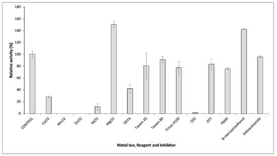 The hydrolytic activity of GaPIP was determined in the presence of different protease inhibitors, metal ions, and chemical reagents. As shown in Figure 6, GaPIP was completely inactivated by several divalent cations, such as Mn2+, Zn2+, Co2+, and Ni2+, whilst Mg2+ significantly improved the activity of GaPIP. Metal chelator (EDTA) partially affected the enzyme activity, which indicated that the GaPIP was a metal-dependent enzyme and required metal ions for enhanced performance. No inhibition of enzyme activity was observed in the presence of reducing reagents, dithiothreitol (DTT), but interestingly, β-mercaptoethanol significantly enhanced the activity. This result suggested that GaPIP is likely to be an aminopeptidase and the presence of disulphide bonds in the structure did not exhibit any crucial role in the catalytic activity of GaPIP. This enzyme was slightly inhibited by a potent serine protease inhibitor, phenylmethanesulfonylfluoride (PMSF) with only 25% inhibition and to a lesser extent by iodoacetamide.