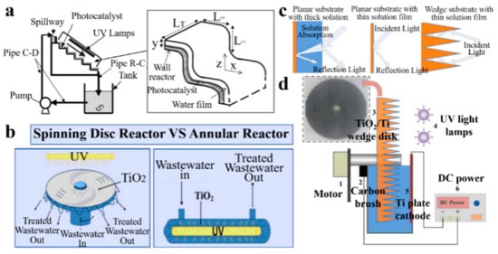 Falling film closed loop step photoreactor. Insert: detail of the steps with associated notation (a) []. Copyright 2011, Elsevier. Schematic diagrams of spinning disc reactor and annular reactor (b) []. Copyright 2013, Elsevier. Schematic diagrams of light utilization in different photocatalytic water treatment processes (c) and schematic diagram of the TiO2/Ti wedge rotating disk photocatalytic reactor (d) []. Copyright 2015, Elsevier.