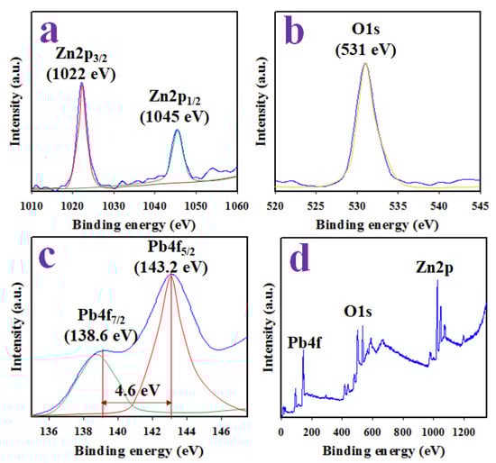 Figure 1 represents the XPS analysis report of PbO-doped ZnO MSs consisting of O1s, Zn2p, and Pb4f orbitals of existing elements only. As shown in Figure 1a, the Zn2p orbital is split in two spin-orbitals such as Zn2p3/2 and Zn2p1/2 located at 1022 and 1045 eV detached with 23.0 eV, which is characteristic value for 2+ ionization state of Zn2+ in PbO-doped ZnO MSs [40,41]. The O1s orbital as revealed in Figure 1b presents a peak located at 531 eV indicating O2− ion associated with the Zn-O bond in the PbO-doped ZnO MSs [42,43]. Besides this, Pb4f orbital shows two spin orbitals of Pb4f7/2 and Pb4f5/2 located at 138.6 and 143.2, respectively, and separated by 4.2 eV, which is recognized for oxidation of Pb2+ in PbO-doped ZnO MSs [44,45].