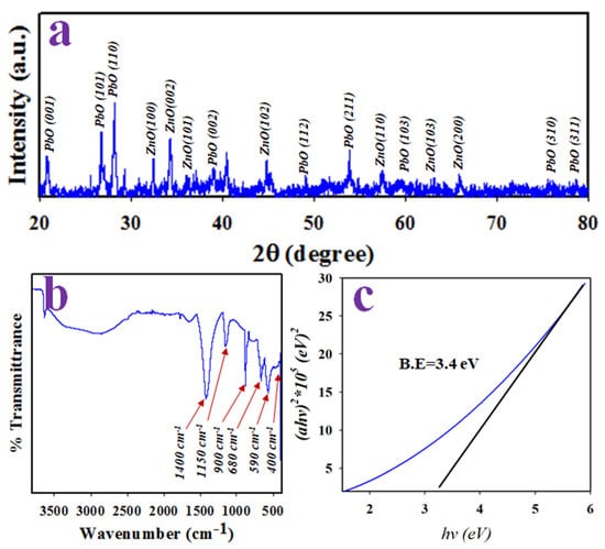 As illustrated in Figure 2b, the peaks due to photo-absorption positioned at 400 and 590 cm−1 are acquired for transverse optical stretching-modes of Zn-O and Pb-O individually in PbO-doped ZnO MSs and confirmed the existence of ZnO and PbO in the prepared MSs sample [50,51]. The appeared peak at 680 cm−1 which is assigned for Pb−O−Pb results from the asymmetric bending vibrations [52]. The absorption peaks perceived at 1120 and 1450 cm−1 are recognized for C-O and H-O bonds, respectively [53,54]. Besides this, the optical bandgap energy of PbO-doped ZnO MSs is calculated from optical absorbance of ultra-violet visible light (UV-vis) as shown in Figure 2c. The bandgap energy is calculated from Tauc relation [αhν = A(hν − Eg)n] and obtained value is 3.4 eV [55].