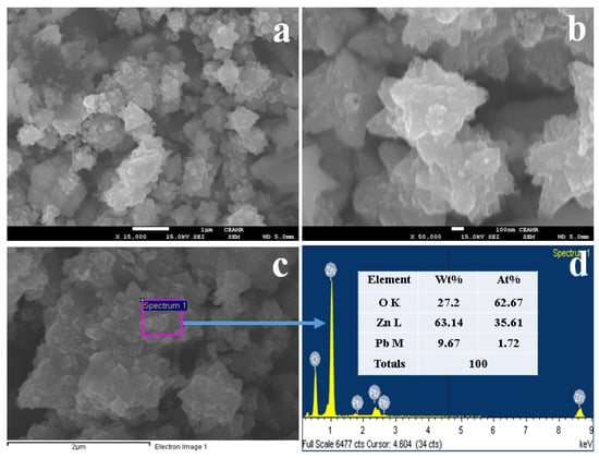 The structural configuration (shape, size and arrangement) of PbO/ZnO was investigated by FESEM analysis as shown in Figure 3a,b. As seeming in Figure 3a,b, the low and high magnifying images are illustrated that the PbO/ZnO are aggregated each other to form a flower-like shape but not a complete flower, and it is really difficult to identify its morphological shape. Therefore, the synthesized PbO/ZnO can be considered as PbO/ZnO microstructures (MSs) in shape. The similar observation is perceived from Figure 3c. The perceived elemental compositions of PbO/ZnO (MSs) as in Figure 3d obtained from EDS analysis consist of O 27.2%, Zn 63.14%, and Pb 9.67% as weight. Assuming the elemental composition of PbO/ZnO (MSs), it looks similar to PbO-doped ZnO MSs.