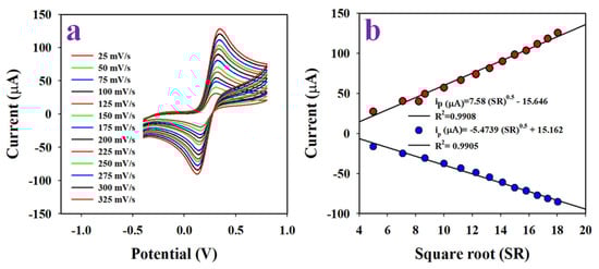 As perceived in Figure 5a, the assembled sensor based on PbO-doped ZnO MSs/GCE is explored the scan rate (SR) of electrochemical (cyclic voltametric) analysis of 0.1 mM solution of Fe(CN)63−/4− in 7 pH buffer. As shown in Figure 5a, the oxidation and reduction peaks positioned at +0.3 V and +0.2 V, respectively, are increased/decreased linearly at a range of SR of 25~325 mVs−1. The peak points current (ip) of oxidation and reduction were plotted as square roots of SR1/2 versus ip shown in Figure 5b and expressed by ip = 7.58 (SR)0.5 − 15.646 (R2 = 0.9908) and ip = −5.4739(SR)0.5 + 15.162 (R2 = 0.9905) corresponding to oxidation and reduction process. As presented in Figure 5b, the linearity is perceived for both plots (oxidation/reduction), and suggested for a good diffusion control in oxidation and reduction reactions of Fe(CN)63−/4− (0.1 mM) in 7 pH phosphate buffer phase.